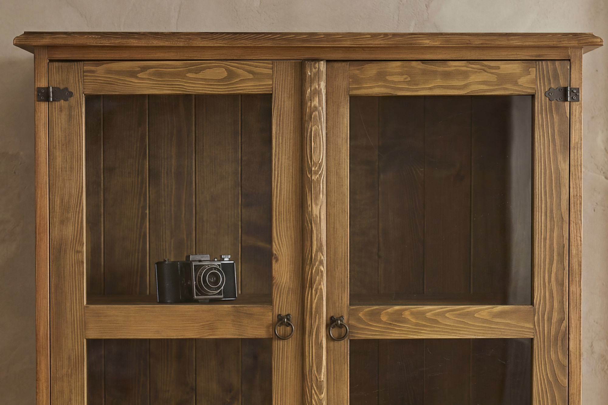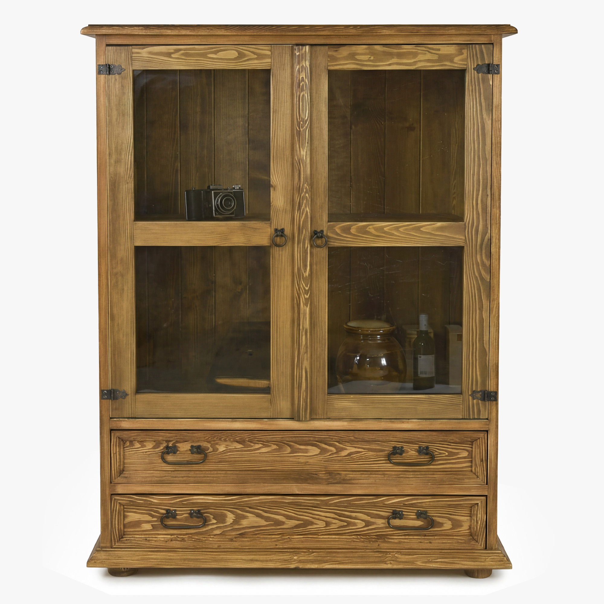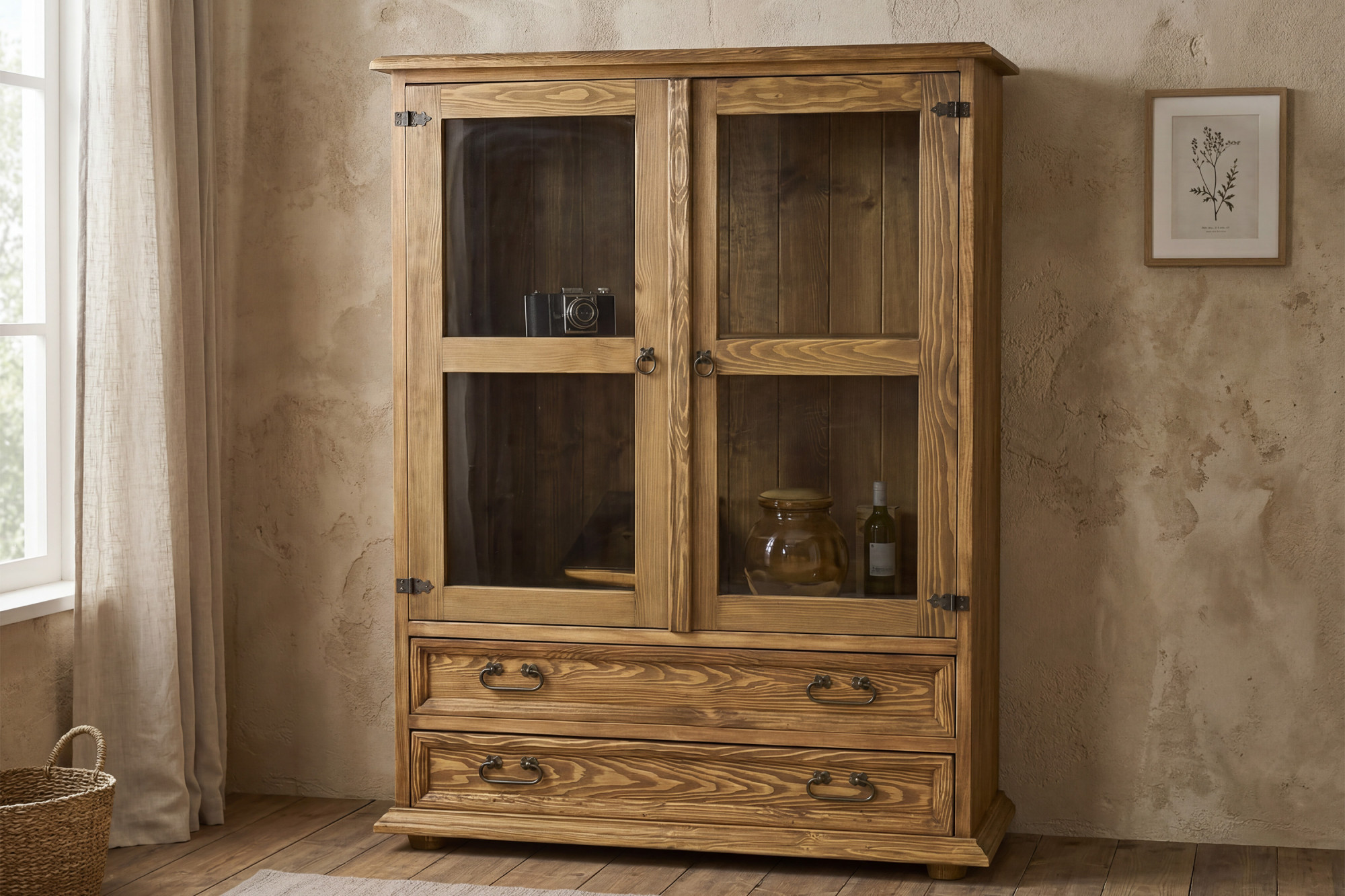 A vitrin kiváló minőségű, tömör fenyőfából készült, amelyet természetes erezet, szilárdság és hosszú élettartam jellemez. Felülete viasszal kezelt, ami kiemeli az autentikus rusztikus megjelenést, és megvédi a fát a mindennapi használat során. A felső részben 2 nyitható üvegezett ajtó található belső fa polccal, így a vitrin praktikus teret kínál porcelán, poharak, dekoráció vagy könyvek kiállítására. Az alsó részen 2 tágas fiók kapott helyet, amelyekben apróságokat, terítőket, iratokat vagy más háztartási kellékeket lehet tárolni.