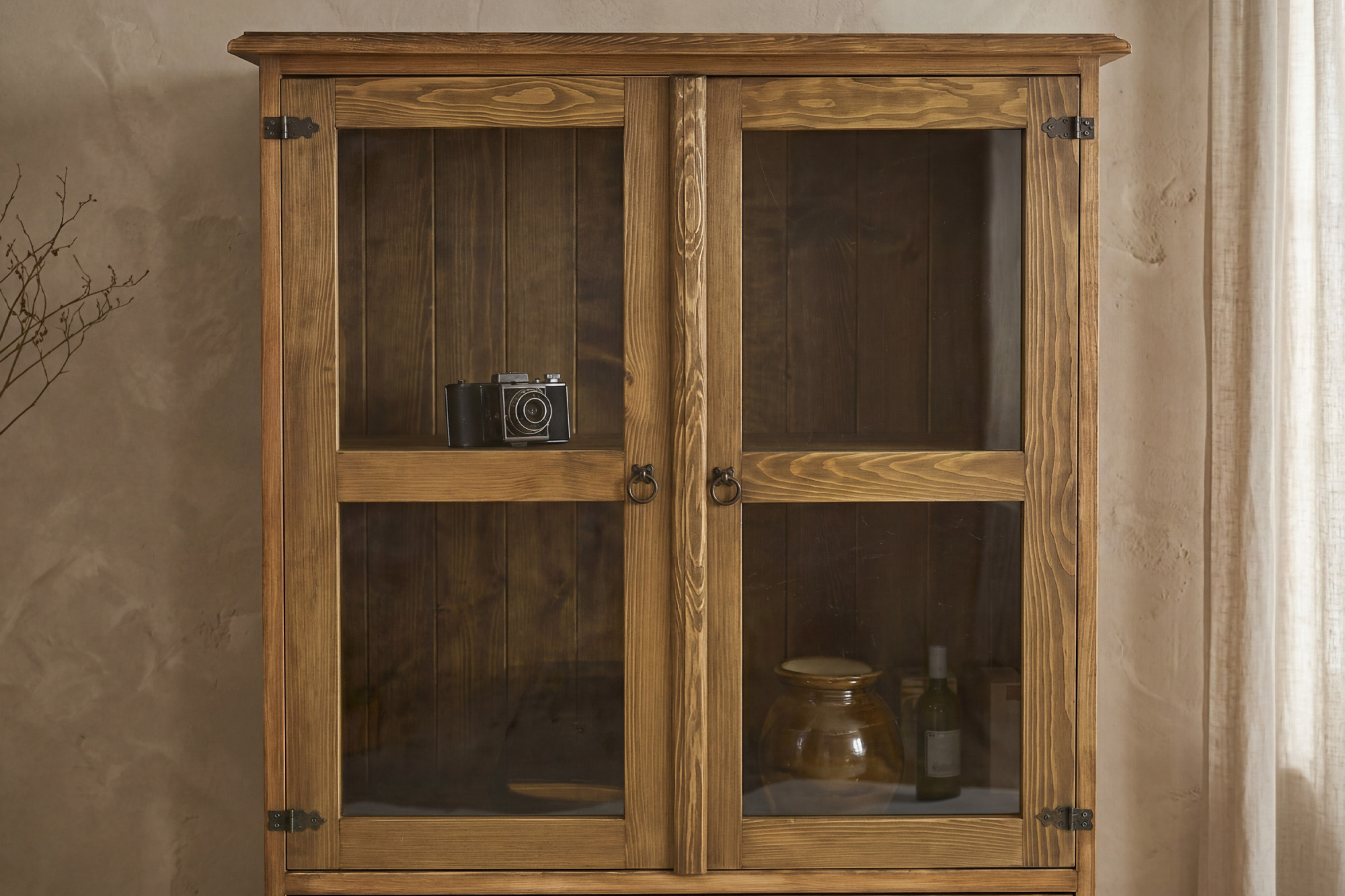 A vitrin felülete viasszal kezelt, amely támogatja a bútor rusztikus megjelenését, és védi a fát a mindennapi használat során.