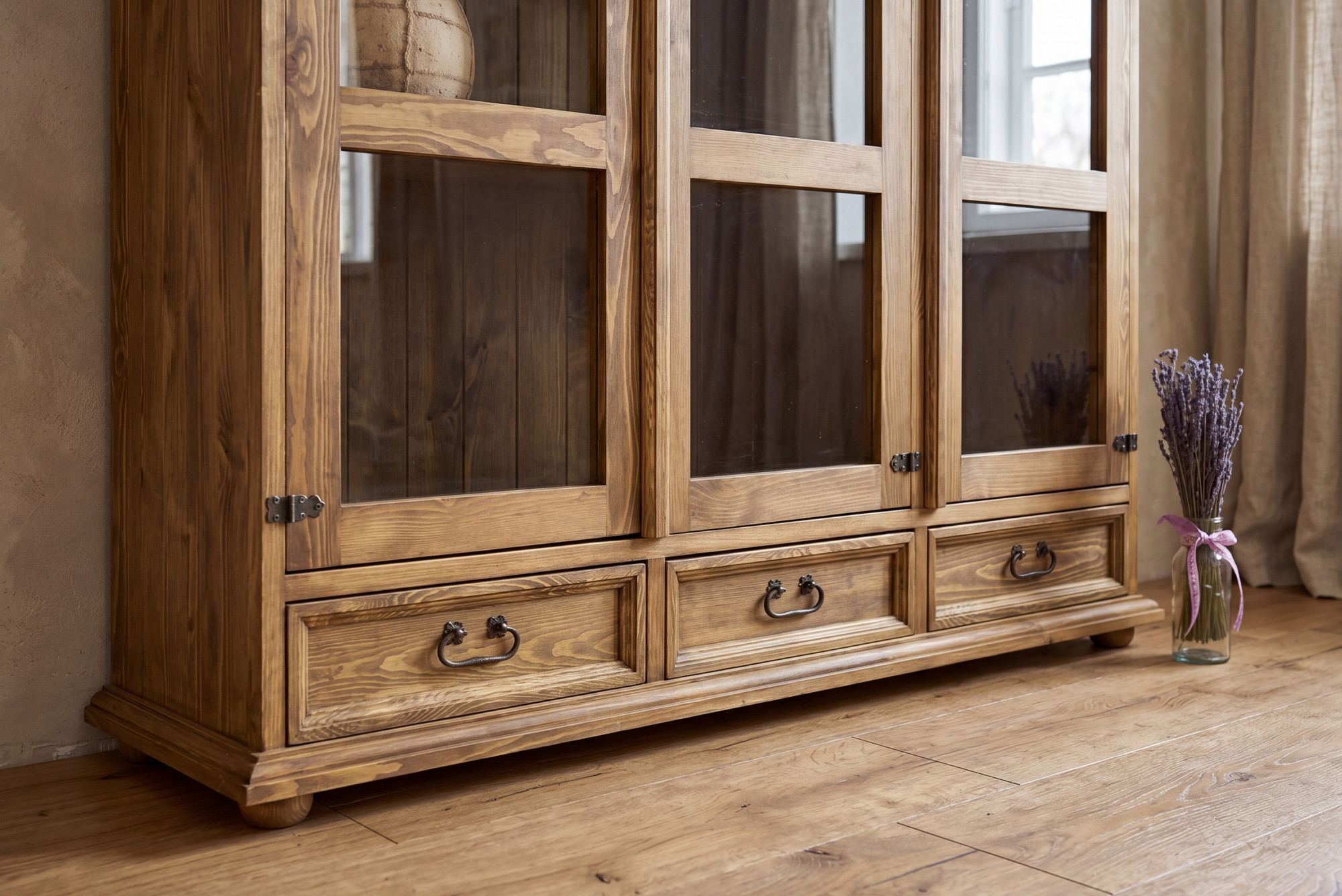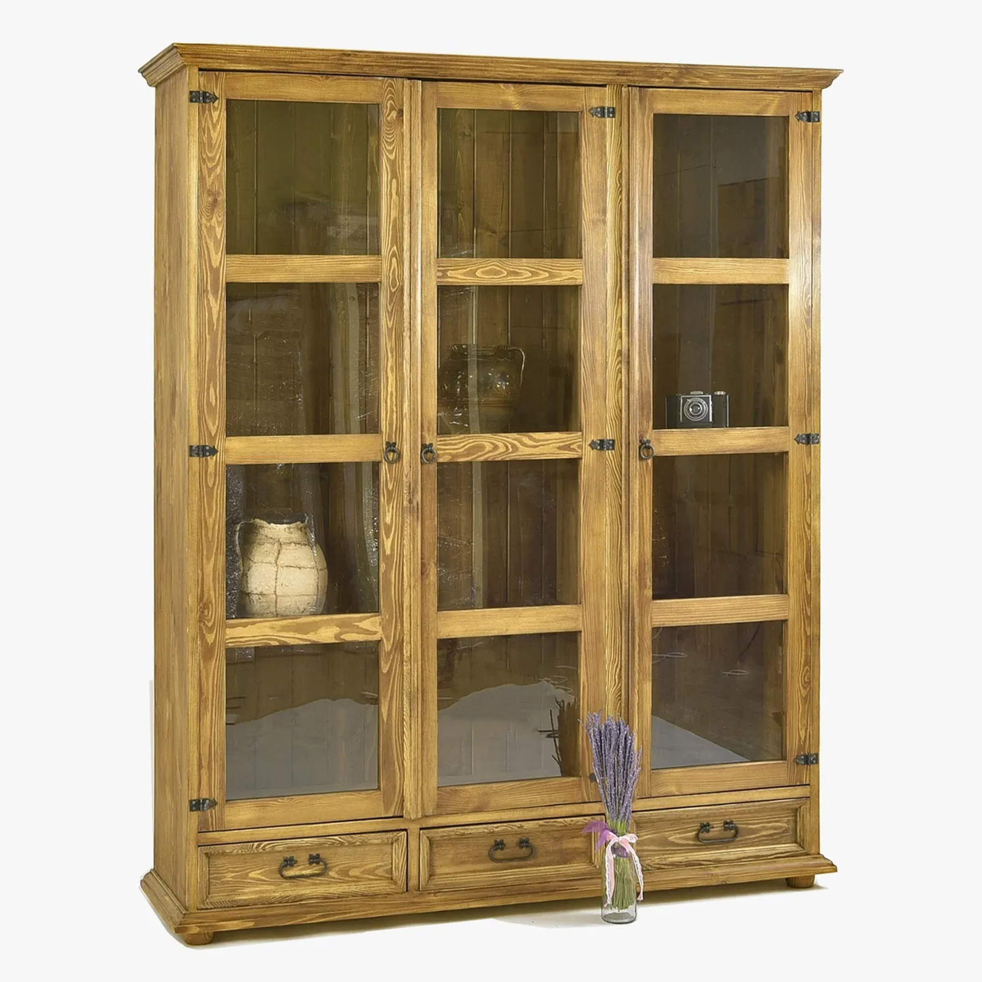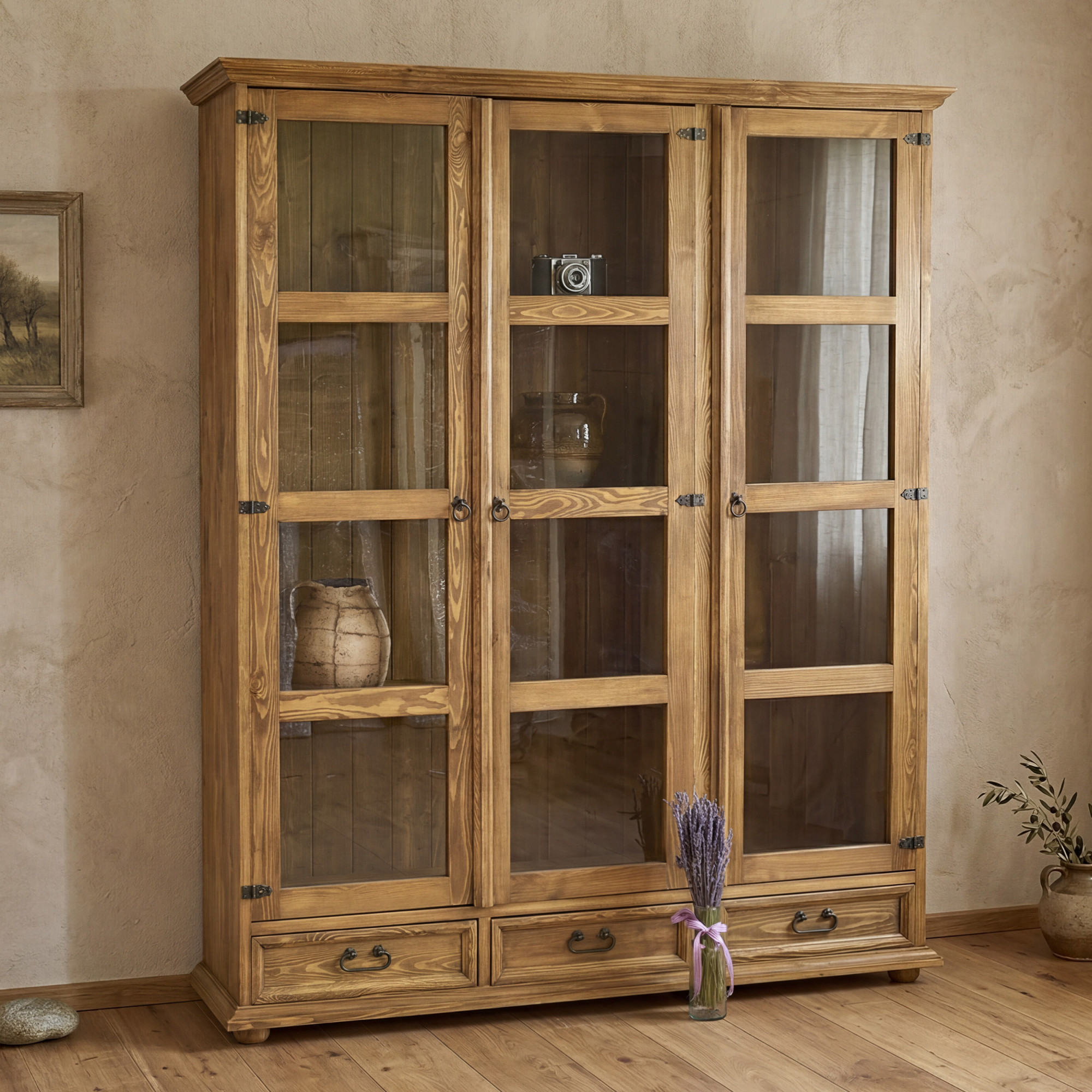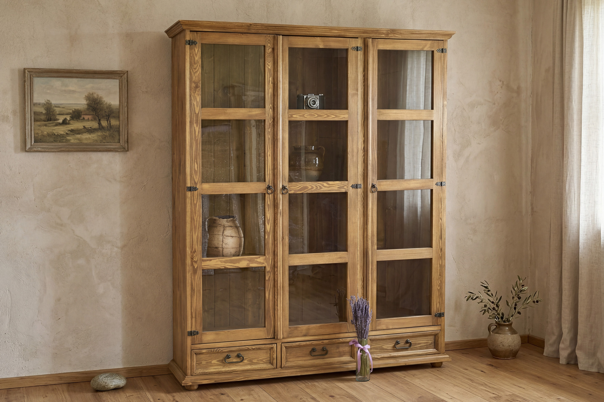 Ez a háromajtós tömörfa vitrin összeszerelve kerül szállításra, így elkerülheti a bonyolult összeszerelést. A belső részben 3 fa polc található, amelyek bőséges helyet kínálnak porcelán, üveg, díszek vagy gyűjtői tárgyak kiállítására. Az alsó részben 3 teljesen működőképes fiók található, ideális apróságok, abroszok, evőeszközök vagy egyéb háztartási kellékek tárolására. A vitrines szekrény felületét kiváló minőségű Supreme Max viasz Ruggeri Brown árnyalatban kezelték, amelyet sötét mézbarna néven is ismernek – ez kiemeli a fenyő természetes mintázatát, és hangsúlyozza a bútor autentikus, rusztikus karakterét.