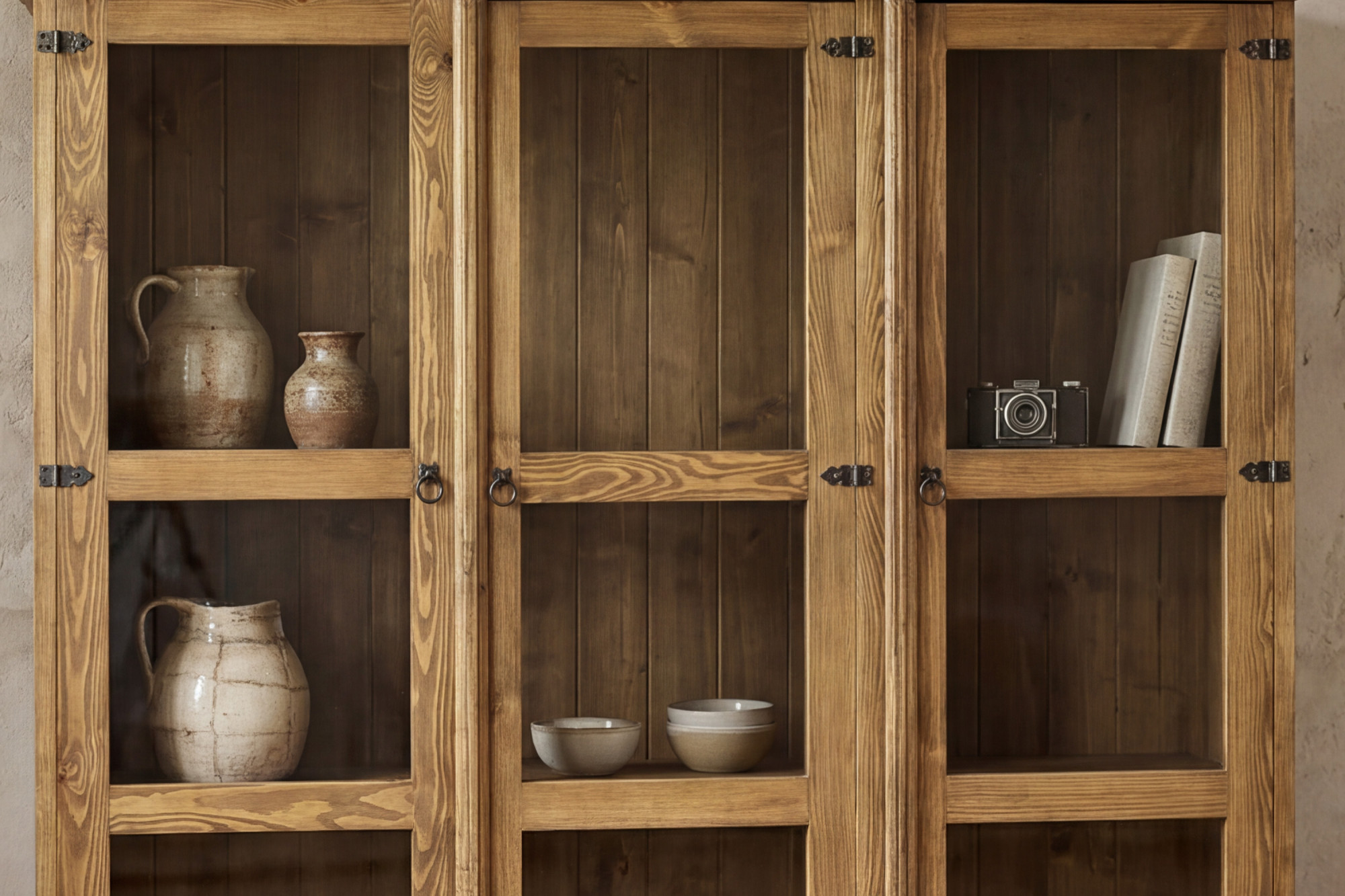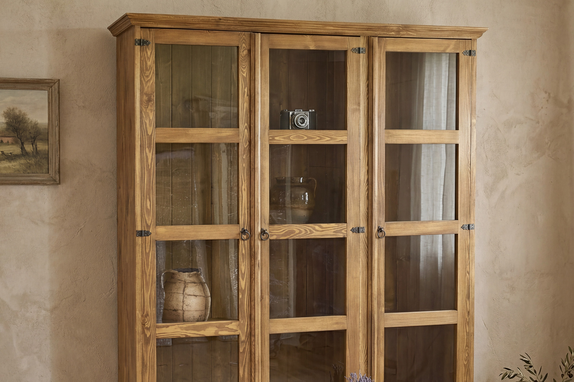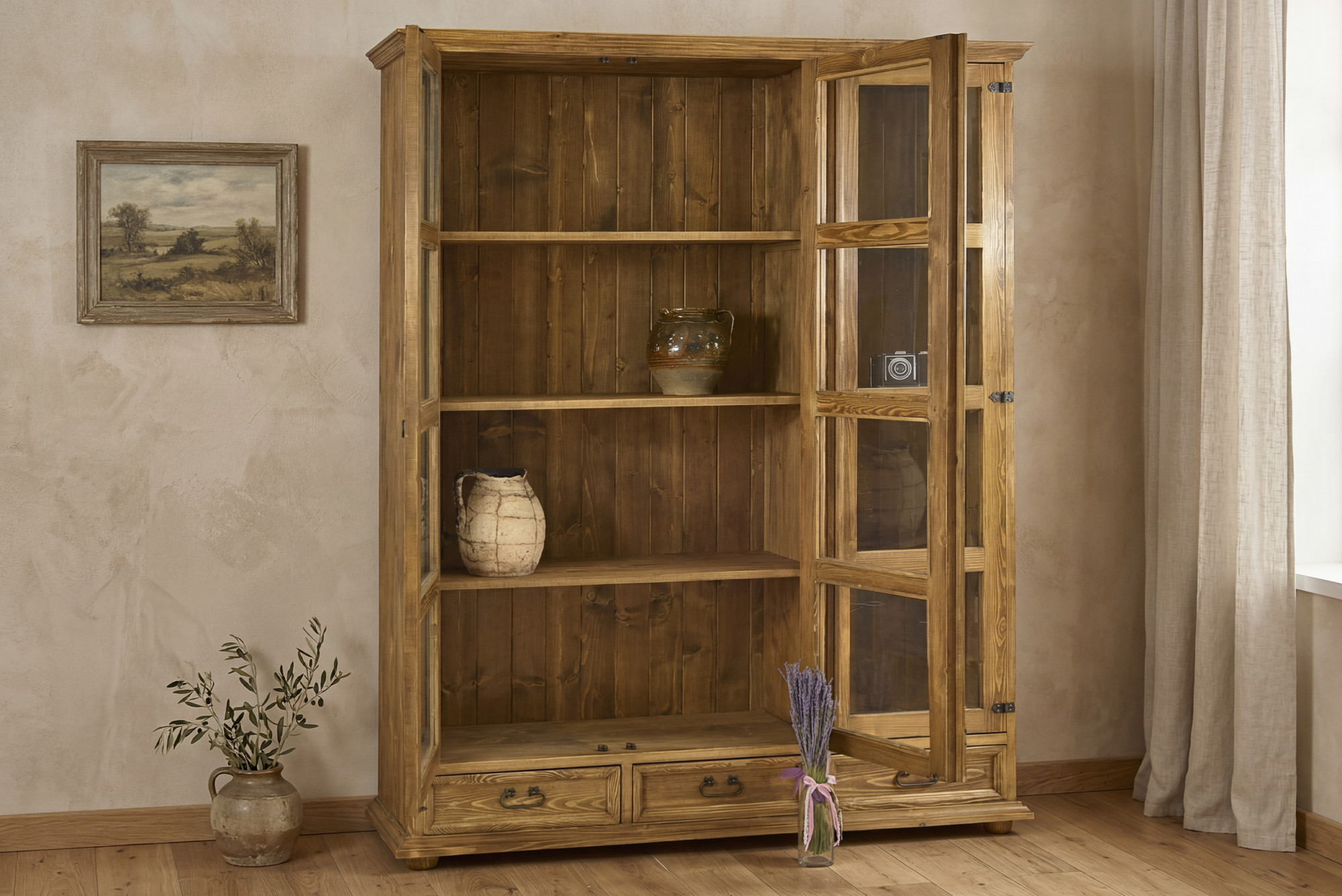 A vitrines szekrény minőségi tömör fenyőfából készül, amely erősségéért, tartósságáért és gyönyörű természetes erezetéért kedvelt.